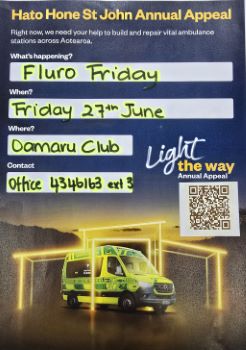 Friday 27th June is our Fluro Friday so remember to come on down to the Club with all your fluro anytime from 11am, spot prizes, nibbles and raffles - all proceeds to our local Hato Hone St John.