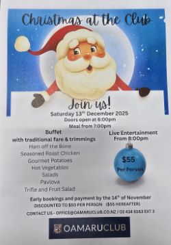 XMAS AT THE CLUB Saturday 13 December, early bird special until 14 November $ 50.00 pp, get a group of friends, family, workplace or the neighbours together for this fun filled night, live entertainment coming all the way from the Hawkes Bay - get in quick as tickets are going fast.